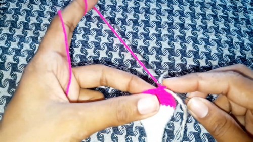 - Rounds 32–33: Switch to pink yarn, 1 single crochet in each stitch around for 36 stitches