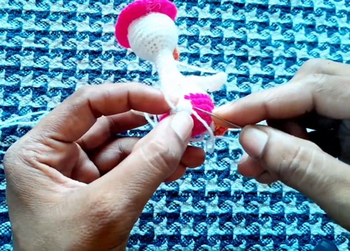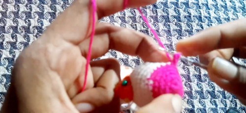 - Tail Pink Yarn: Magic ring with 6 single crochet, round 2 work 1 single crochet and 2 single crochet in next stitch repeat for 9 stitches, round 3 single crochet in each stitch