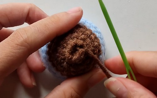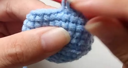 - Stuff firmly. Cut yarn, weave through front loops, and pull tight to close.