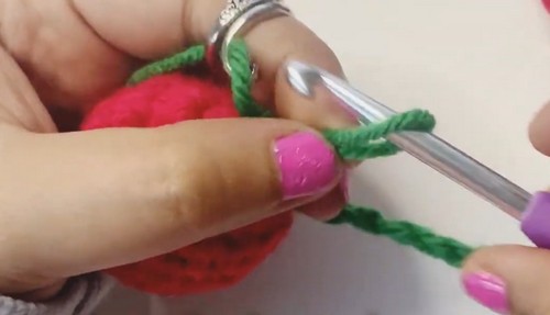- Attach green yarn to the top of one cherry