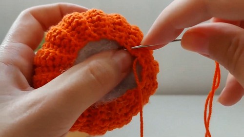 - Optional shaping can be added by passing yarn through the center from top to bottom and tightening to create a squashed pumpkin look