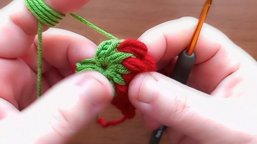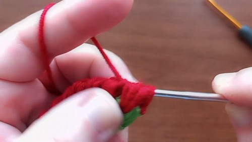 - Insert hook into first leftover front loop from R2 and pull up green yarn.