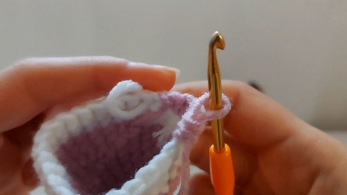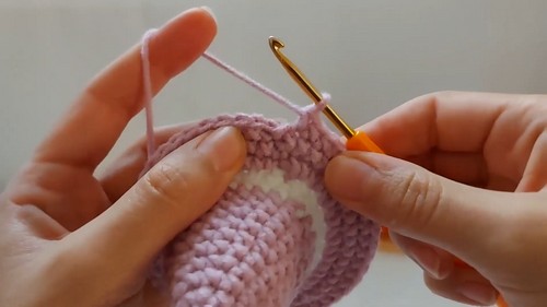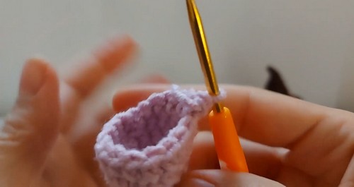 - Round 5: Work 2 single crochet then increase, repeat around for 8 stitches