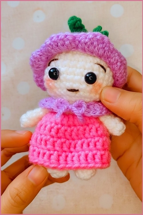 From her pink and purple dress to her signature bellflower hat, every element captures the essence of nature’s beauty. Perfect for gifting, decorating, or adding to your handmade doll lineup, this project is beginner-friendly and customizable with your favorite colors.