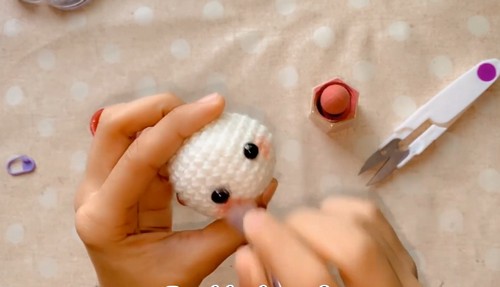 - Add safety eyes between R9 and R10 with 6 sts apart