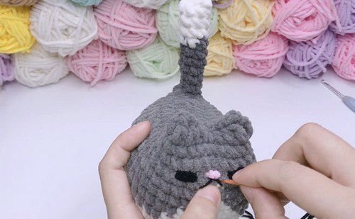 - Add eyes on Round 8, nose between R8–R9, and second eye two stitches away from nose