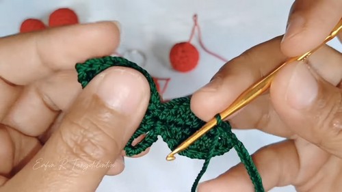 - Starting in the 2nd chain from the hook: sl st, sc, hdc, 2 dc in next stitch, hdc, sc, sl st.
