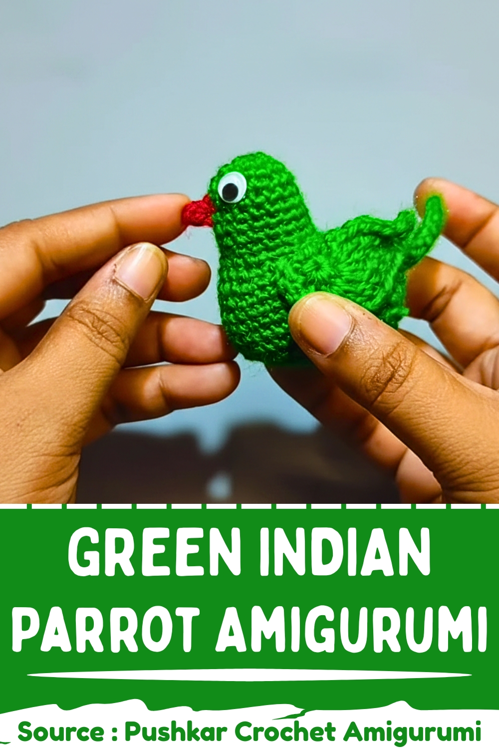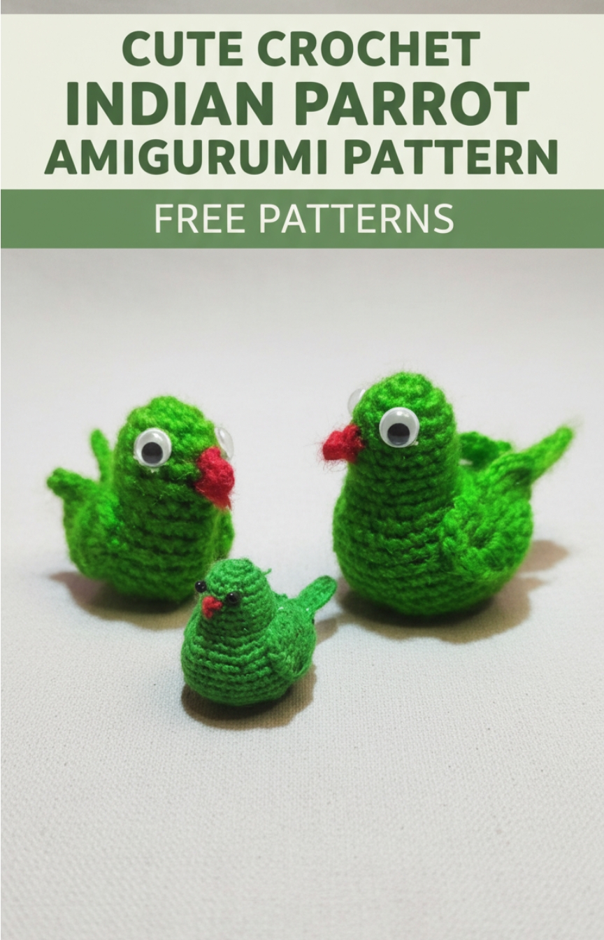This Green Indian Parrot crochet pattern is inspired by the classic ringneck parrot and based on the tutorial by Pushkar Crochet Amigurumi. The pattern walks you through each step to create a smooth, well shaped parrot with a bright beak, elegant long tail, and signature neck ring.