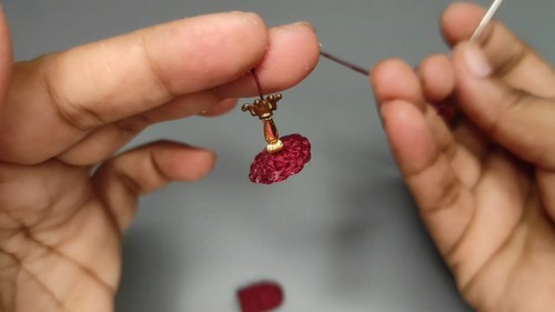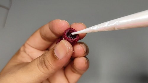 - Insert the red wine piece into the glass body, sew the edges together using the red yarn tail, add a small amount of stuffing, and close securely