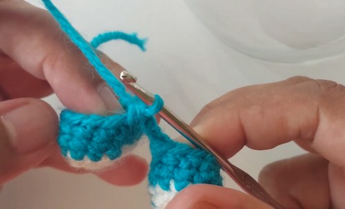• Row 1: Six single crochet into a magic ring using blue yarn