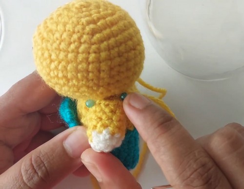 • Arms: Make two, start with four single crochet in a magic ring using white yarn, increase to eight stitches, change to yellow yarn, and single crochet around for five more rows