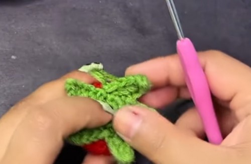 • Make five small leaf petals with green yarn